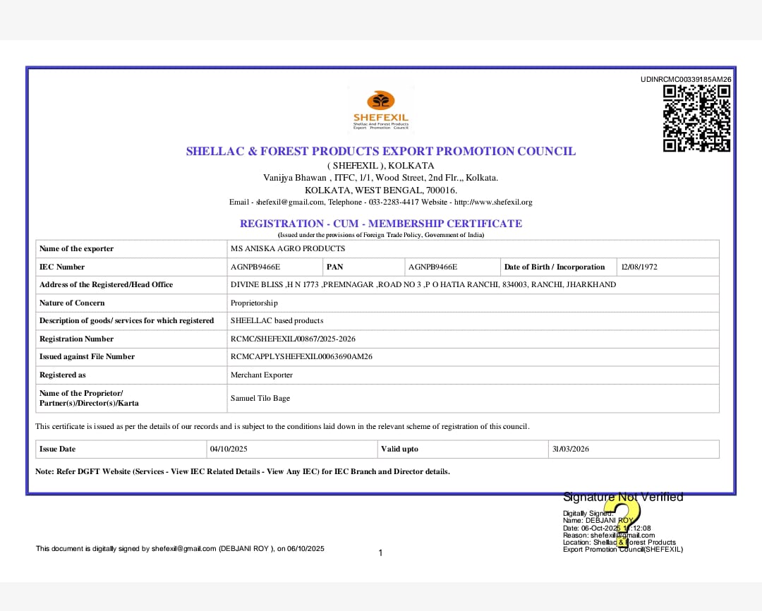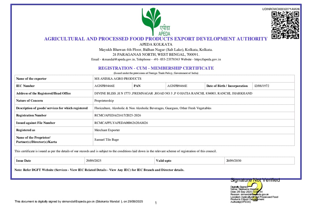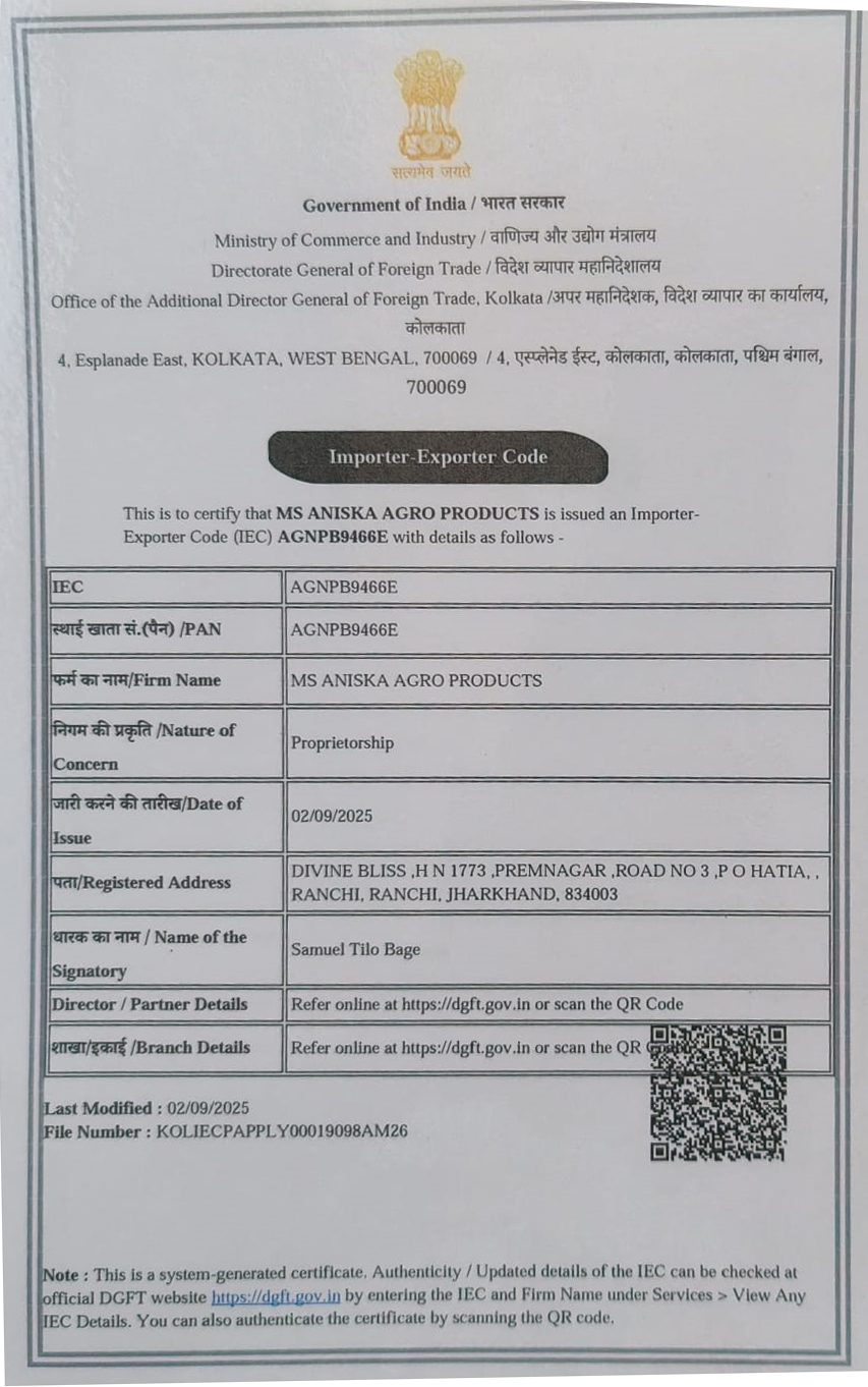 Aniska Agro Products is registered under Government of India, Ministry of Commerce and Industry. Click to view Import & Export License